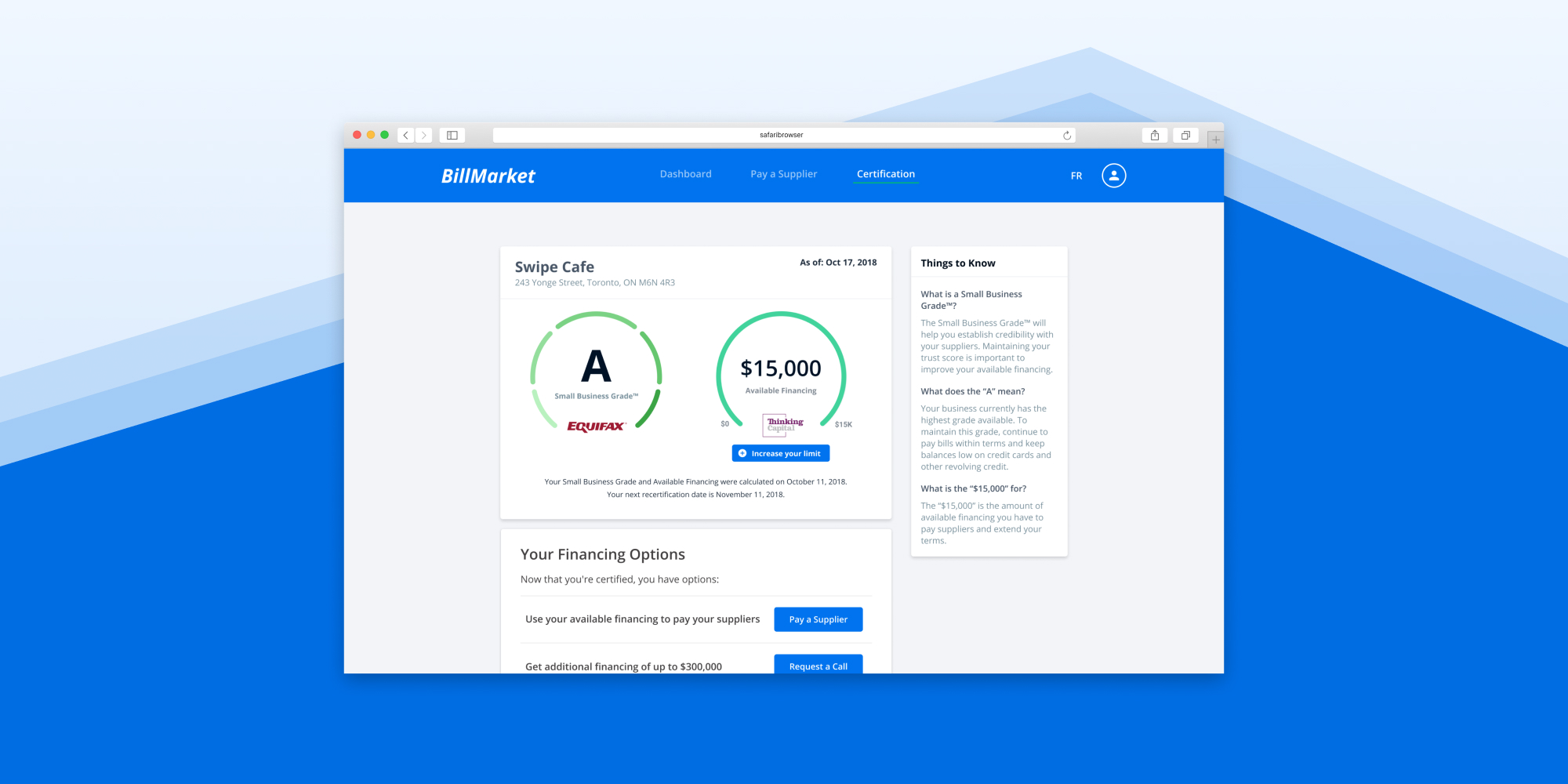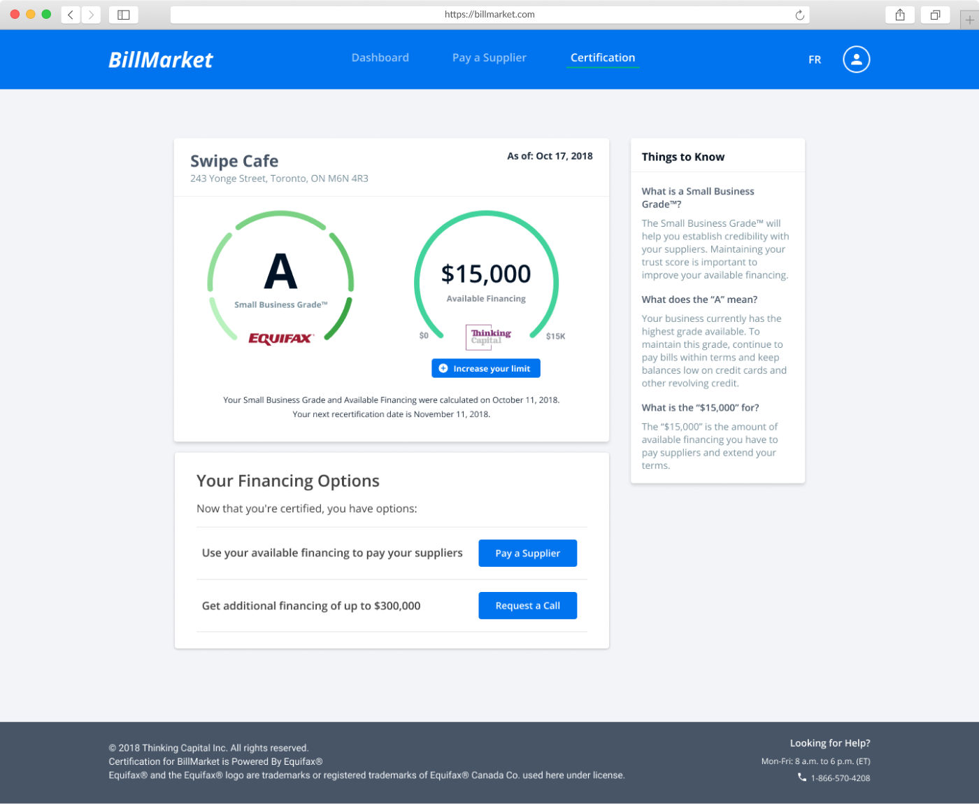 The dashboard is where the customer would be able to see their small business grade and associated available financing. We also added quick links to financing related tasks here as well.
