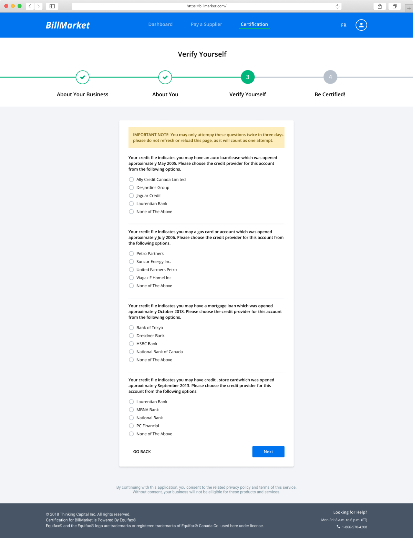 We solved for the extensive verification by leveraging services. In place of our previous government ID and void cheque we leveraged an Equifax service called E-ID.