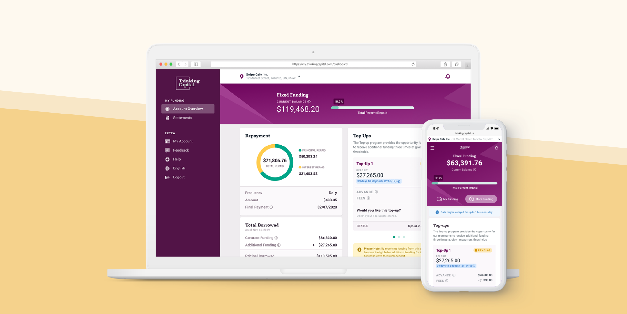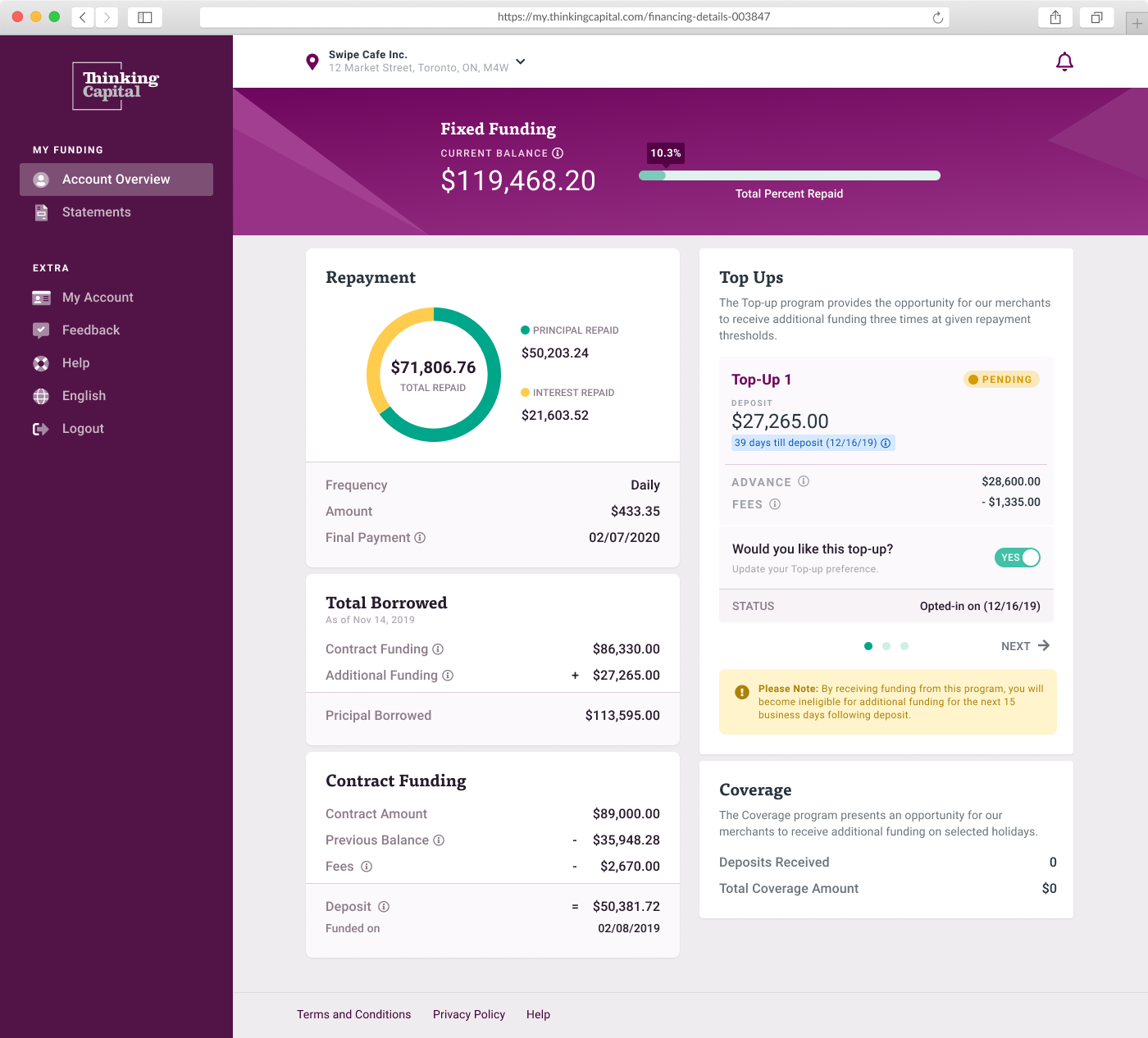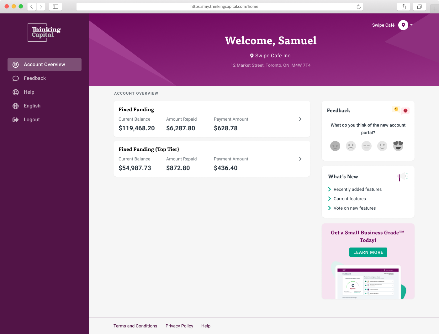 While at Thinking Capital, there was always a big focus on producing new products. We didn't spend much time focused on creating products for existing customers. One of the things that were sorely lacking for our loan customer was an online financing portal. If customers wanted any information, they would call a support agent who would send them what they need. In July of 2019, I started working on designing a portal for our loan customer. We launched the portal in October of 2019 and had onboarded 1500 customers by the end of November.